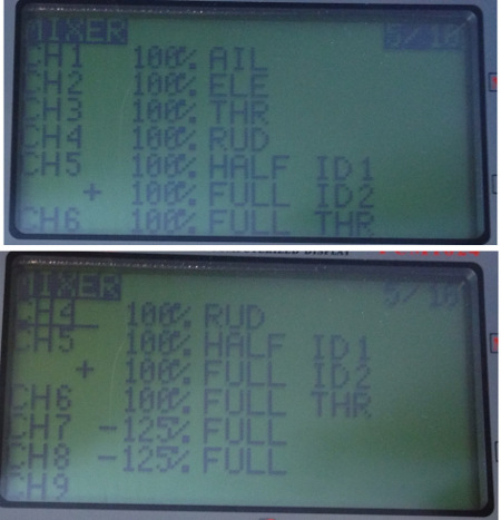 In the 9XR radio, setting up the following the mixer screen will give correct behavior with the ‘THR CUT’ switch used for arming and the ‘AUX.3’ switch used for mode selection.